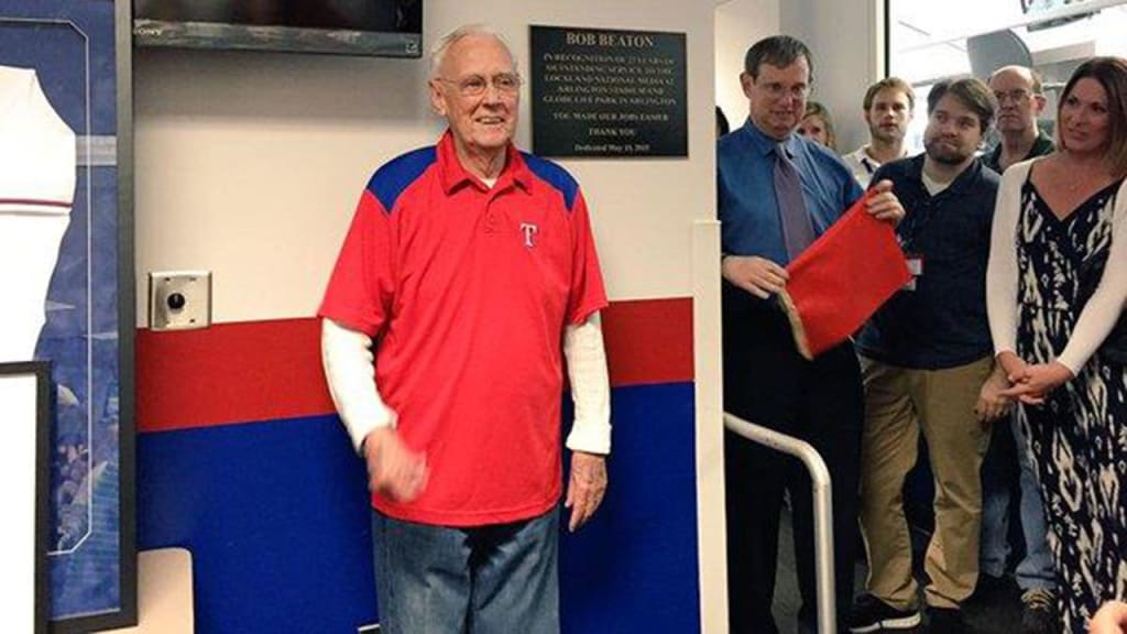 ARLINGTON -- Bob Beaton, who served as the beloved press box attendant at Arlington Stadium and the Ballpark in Arlington, passed away on Dec. 24. He was 86. Beaton was a retired accountant and originally from New Jersey when he took over running the press box in 1988. He retired after the 2014 season, and he was honored with the dedication of a plaque in the press dining room on May 15, 2015. Beaton was well known to both the local and national media. He knew everybody by name, greeted them with a smile and was unswerving in his dedication to helping any way he could. "Bob did whatever he could to make our jobs easier, and he was happy to do it," said Jeff Wilson, the Fort Worth Star-Telegram's lead Rangers writer. "He also read all our stories, got to know about our families, and would give us good-natured ribbing. He was a good man with a good heart. He has been missed since stepping aside, and he will be missed going forward." Beaton maintained seating assignments, kept peace and order in the press box, passed out statistics, lineups and game notes, and he fulfilled personal requests, including providing antacid tablets to one baseball writer with a particularly cranky digestive system.