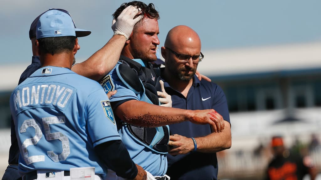 "Caught a pitch, and I didn't really hear anything," Ciuffo said. "But I felt something hit my head. Then I kind of leaned over, and I was like, 'Oh, man, he hit me.' Because for a second I thought I was sweating a bunch. And I opened my eyes and saw blood on my arms. That's when [Major League medical coordinator Paul Harker] Hark and [Kevin] Cash, and [head athletic trainer] Joe [Benge] came out. ... They were like, 'Don't move, stay down.' They put some pressure on it.