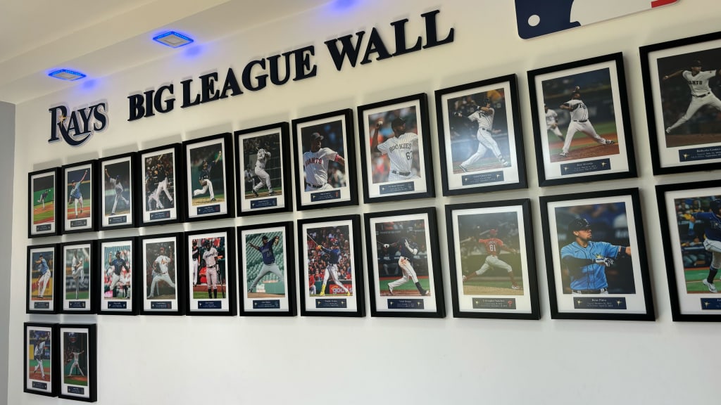 There are photos of the Rays, past and present, as well as famous moments in franchise history on the walls throughout the facility. But there is one space in particular that serves as motivation for the players. Just outside the dining room is the “Big League Wall,” which contains framed photos of the 24 players who reached the Majors after spending time at the academy. Recent additions include two players on this trip: infielder Jonathan Aranda and catcher René Pinto.