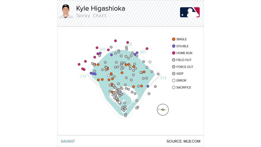Why was Higashioka a target? In his career, about 54 percent of his batted balls have been fly balls or line drives, which is a bit above the MLB average of around 49 percent. He also pulls the ball a lot (46 percent). Due to those two factors, just three of Higashioka’s 144 career batted balls entering the day had been grounders to the right side, reducing the risk of moving the second baseman to the outfield.