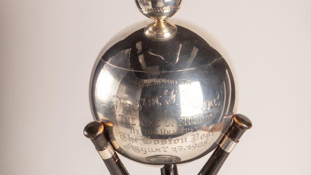 Fun facts: On Aug. 13, 1908, Massachusetts Lieutenant Governor Eben Draper presented this silver loving cup to Red Sox pitcher Cy Young, who was known as the "The King of Pitchers." The Boston Post newspaper had collected donations from the pitcher's many fans in order to have the majestic trophy made in time for the celebration dubbed "Cy Young Day" at Boston's Huntington Avenue Grounds.