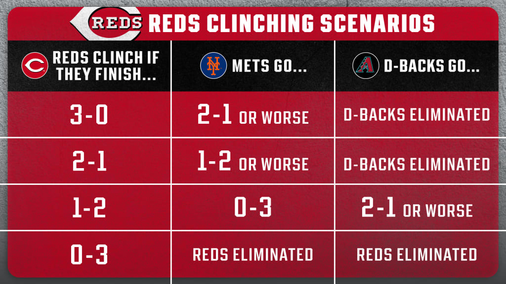 The Reds (81-78) remain in pursuit of that final spot, sitting one game behind the Mets (82-77). The D-backs are also alive at 80-79. Cincinnati has a series against the Brewers in Milwaukee on tap, while the Mets square off with the Marlins in Miami and the D-backs face the Padres in San Diego.