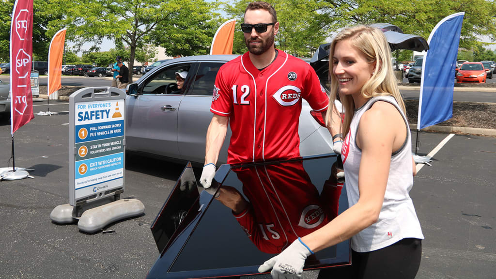 Reds catcher Curt Casali and his wife, Rene, assisted at the PNC Bank in Mason/Deerfield Township on Friday, where a location record was set with 801 cars.