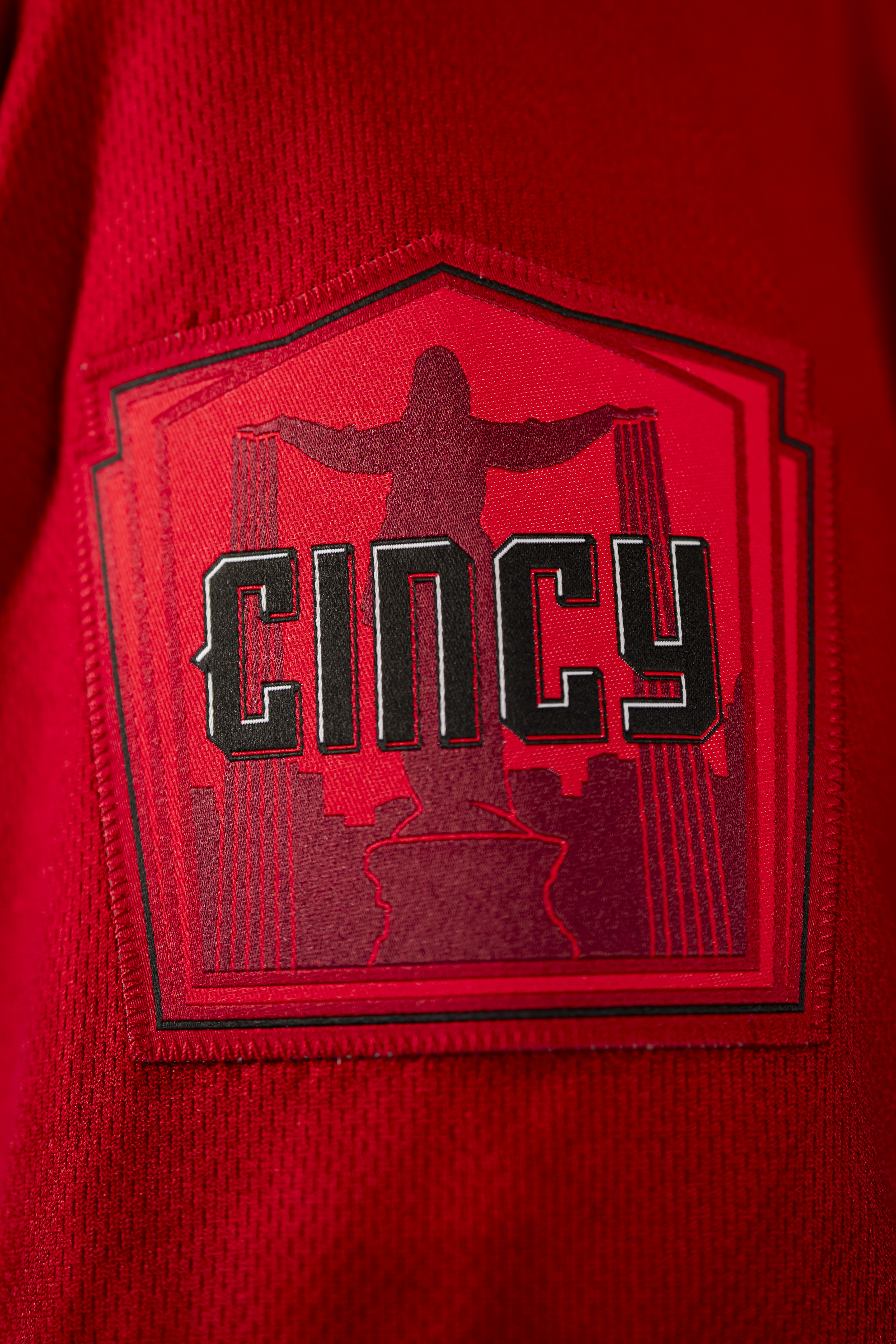 On the sleeve patch is a black "Cincy" wordmark that was featured across the chest of the original City Connects. It's situated above a graphic feature of the familiar Tyler Davidson Fountain on Fountain Square in the heart of downtown Cincinnati.