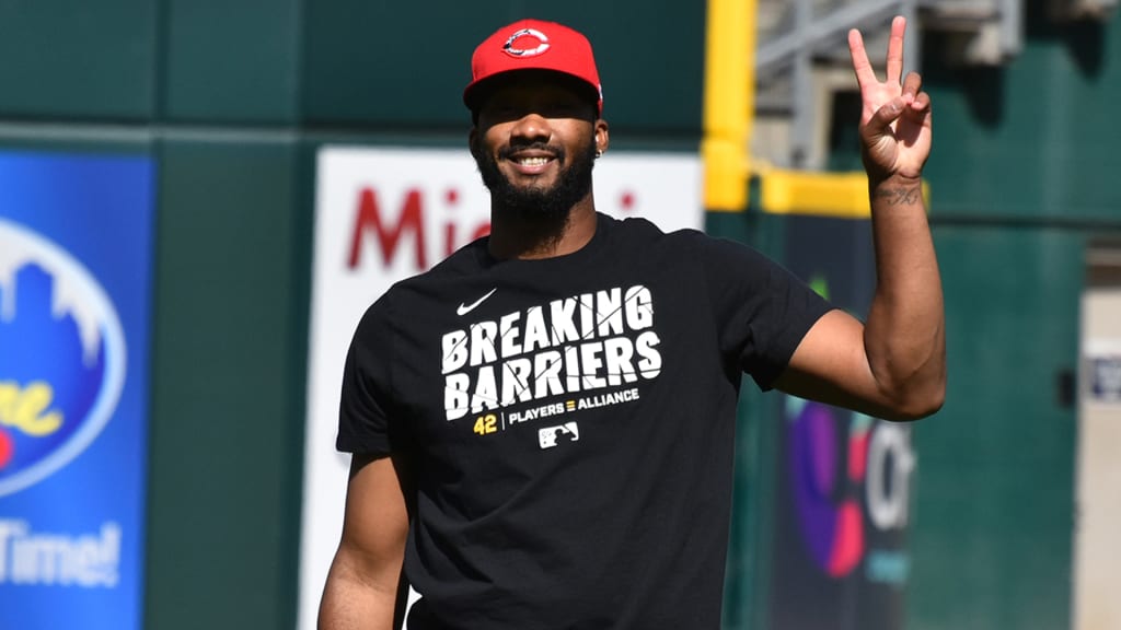 With the Reds having the day off on April 15, the Jackie Robinson Day festivities were held on April 16, when the team resumed play against Cleveland. Earlier that day, Reds pitcher Amir Garrett and first base coach Delino DeShields participated in a virtual school visit with students-athletes from Clark Montessori High School to discuss Robinson’s impact. At the ballpark, many Reds players wore Players Alliance shirts during batting practice to raise awareness for Jackie Robinson Day.