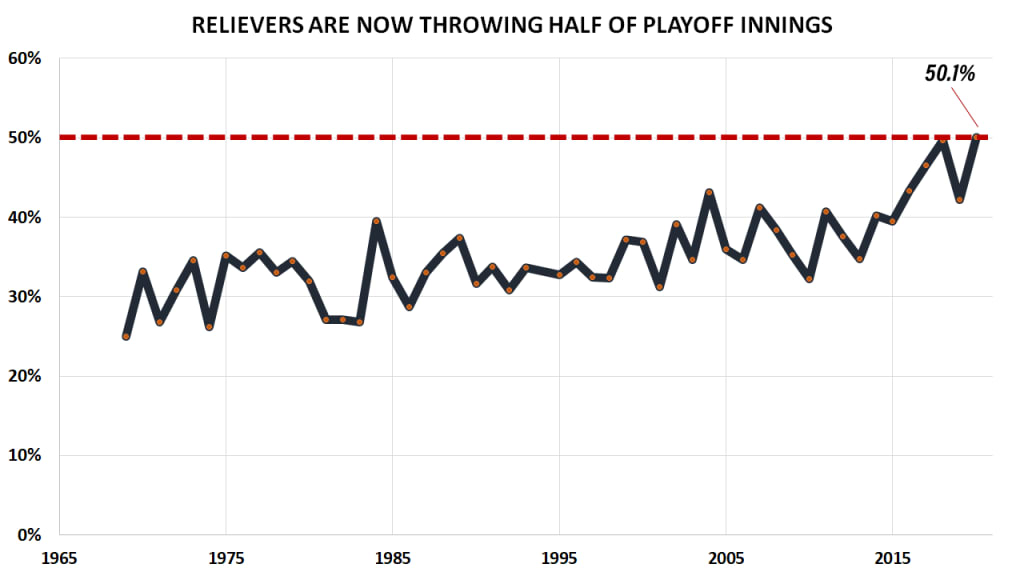 After many years of relievers throwing about one-third of postseason innings, their share began climbing in 2015 and topped 50% for the first time ever in 2020. (We’ll stipulate that the 2020 playoffs were unusual, to say the least, but 2018 was only a fraction of a percent behind it, and the Nationals singlehandedly affected 2019.)