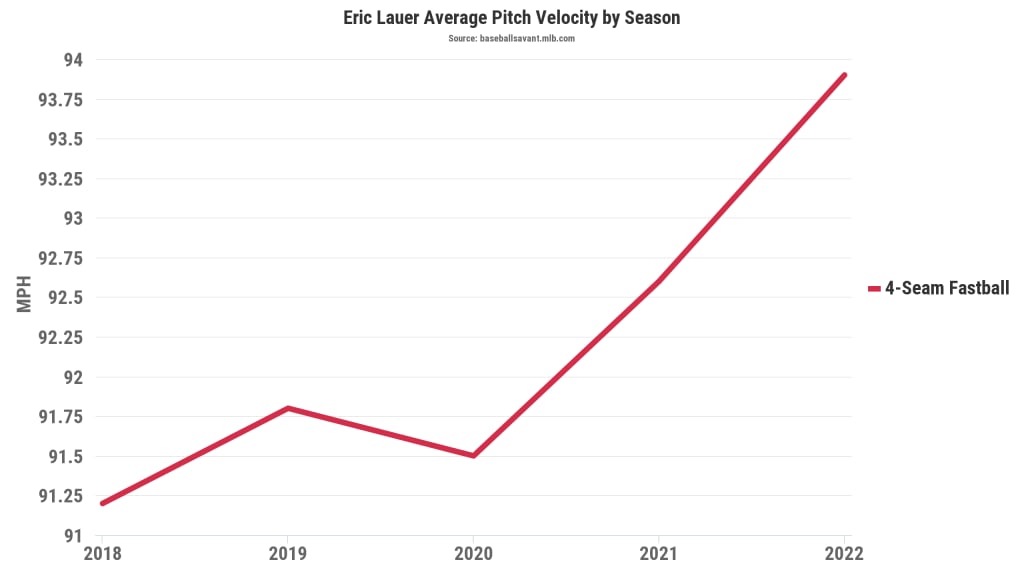 Lauer’s four-seam fastball has propelled his rise from afterthought to ace. When he first broke into the Majors, he sat around 91 mph with the pitch. Now, his average four-seamer velocity is around 94 mph, and he’s thrown 53% of his four-seamers faster than that, compared to just 5.4% from 2018-21.