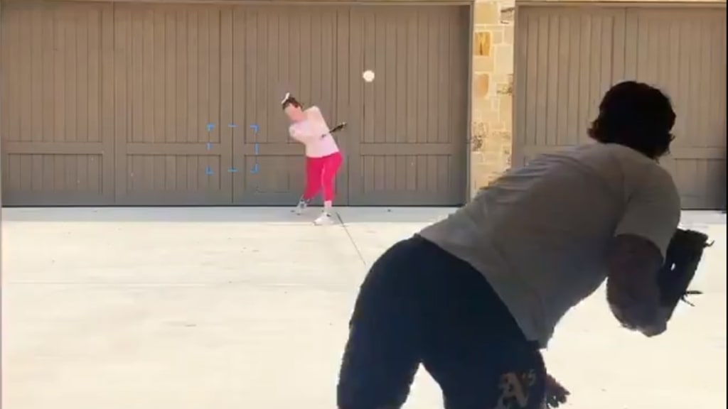 Sartain-Vaughan, a former Texas A&M softball player, returned the favor by roping an absolute laser off her husband. After admiring the shot from one knee as it sailed over the couple’s garage, Sartain-Vaughan launched an over-hand bat flip of her own -- one that may or may not have landed yet – then strutted toward first base.