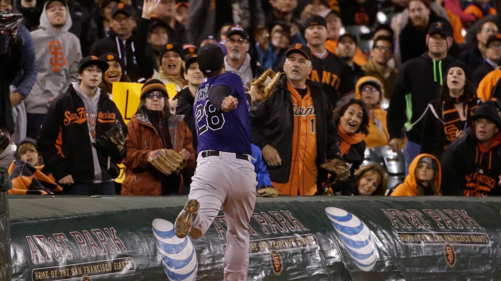 The play that took Arenado from unforgettable to unfathomable was one he later admitted he maybe should have let go. Grégor Blanco’s foul ball sailed toward the rolled-up tarp along the fence behind the Giants’ bullpen just down the third-base line. Arenado sprinted, then dove headlong to snare the ball, flying over the tarp and crashed against the fence. A fan at Oracle Park who extended her gloved hand trying to catch it herself kindly reached out to protect Arenado from injury. Arenado then sat up on the tarp and nearly doubled a runner off base in the signature glove play of the decade.