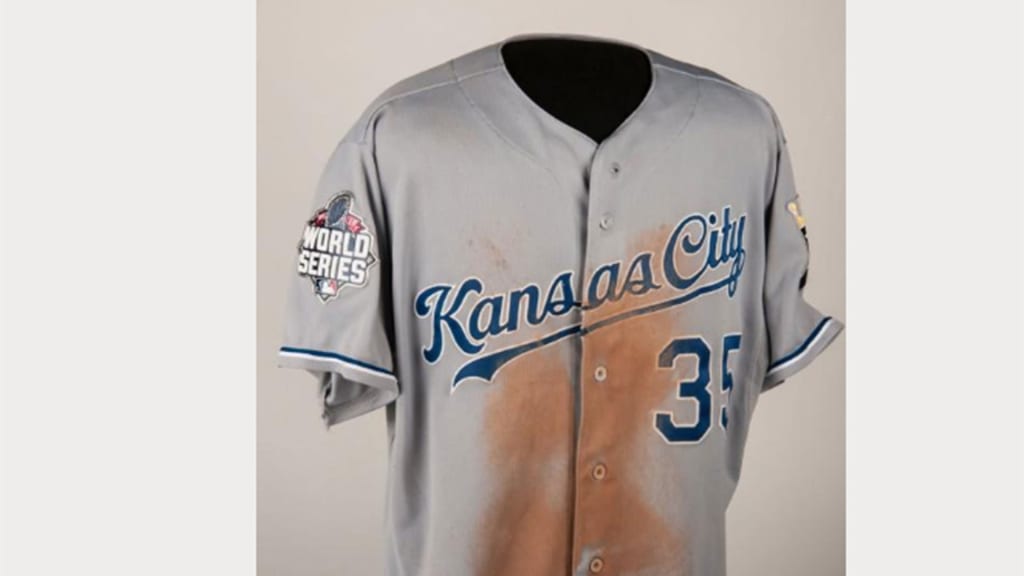 Fun facts: Kansas City’s Eric Hosmer wore this jersey in Game 5 of the 2015 World Series, when his daring, headfirst slide home in the ninth inning tied the Mets, 2-2, and pushed the deciding World Series game into extra innings. Hosmer’s mad dash exemplified the Royals’ hard-charging, aggressive style of play.
