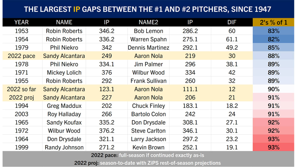 Right now, Alcantara leads Aaron Nola by 12 innings. Historically, at least in integrated-era baseball, that's not by itself notable, but that's also not surprising, because we're not even to the All-Star break yet. More interesting, then is to take the second place finisher's total as a percentage of the first. Nola has thrown more innings than every pitcher in baseball save Alcantara, but he's also thrown only 90% of the innings Miami's ace has. Where does that stand out?