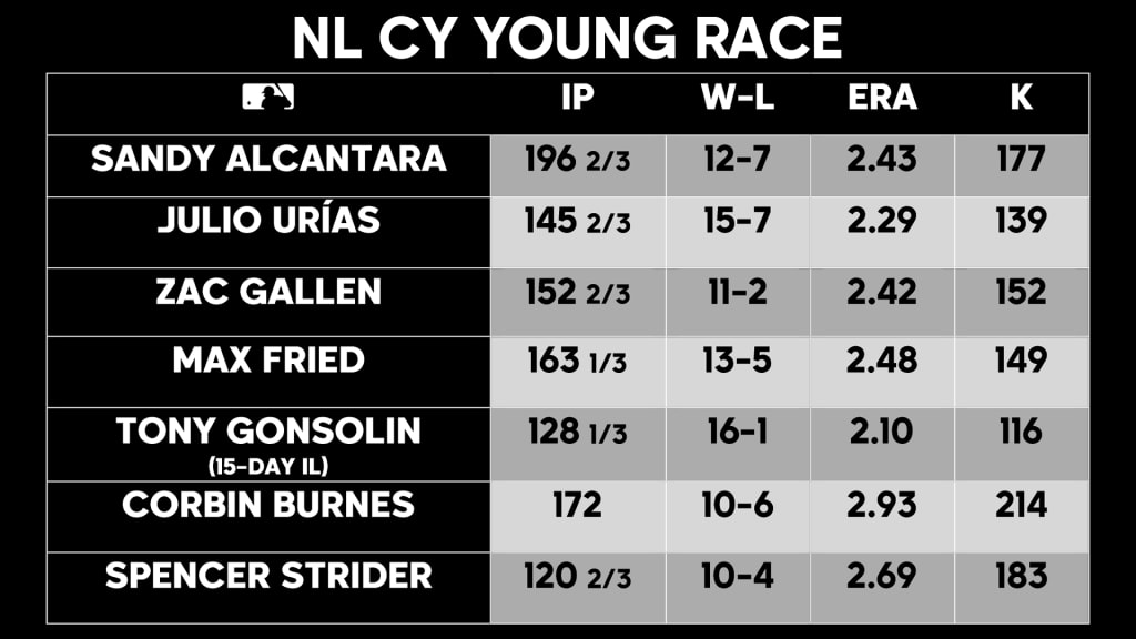 The rundown: Gonsolin's numbers are simply ridiculous: 16-1 with a 2.10 ERA, a 0.86 WHIP and a .169 opponents' batting average. Unfortunately, he's pitched only 128 1/3 innings in his 23 starts -- an average of 5 2/3 innings -- and he now finds himself on the 15-day IL with a right forearm strain. Even if he returns to make a few more starts, it's hard to imagine him pitching enough innings to earn the Cy Young.