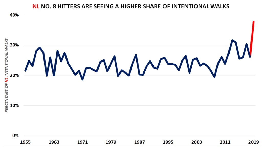 (Why? In part because the gap between No. 8 hitters and pitchers hitting has continued to grow over the years, and it's not just about pitchers being completely unable to hit. It's because even No. 8 hitters can mash the ball now. Put another way, this year, the gap between NL No. 8 hitters [.685 OPS] and pitchers hitting [.327] is 358 points. By comparison, back in 1971, when the share of free passes to NL No. 8 hitters was at its lowest, the gap between their .614 and the .382 of pitchers that year was only 232 points.)