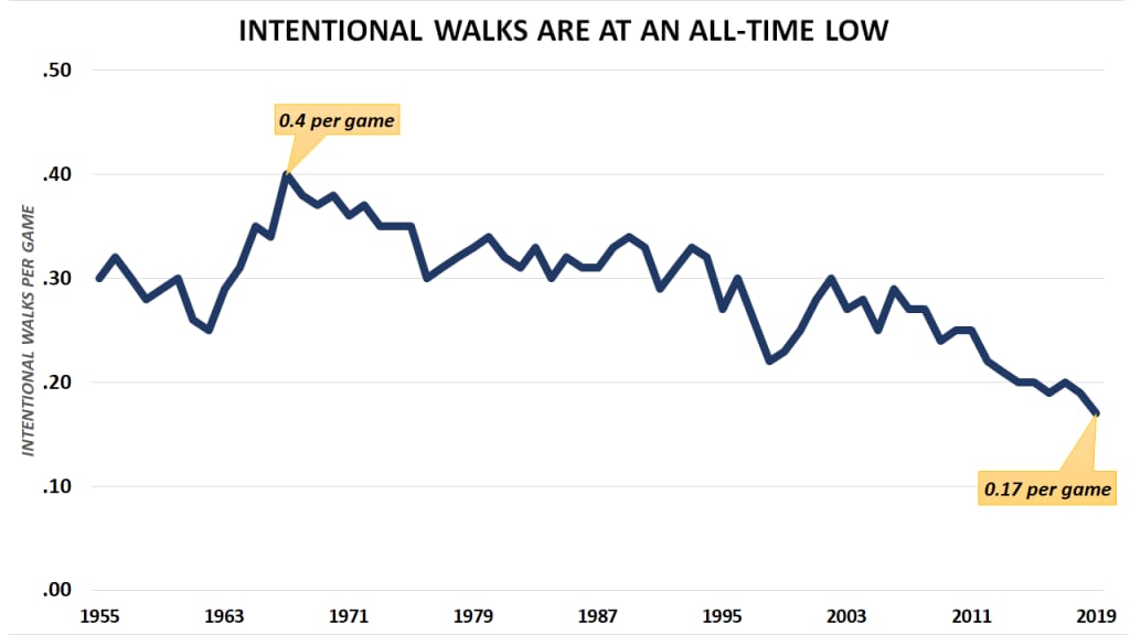 To put that in easier-to-understand terms, we're on pace for only about 820 intentional walks this year. Ten years ago, that was nearly 1,200. Back in 1969, the first year of the divisional era -- when there were still only 24 teams -- there were 1,436 free passes. What that should make clear is that this isn't really related to the change to no-pitch intentional walks, put in place prior to 2018. This is about teams deciding it no longer makes sense.