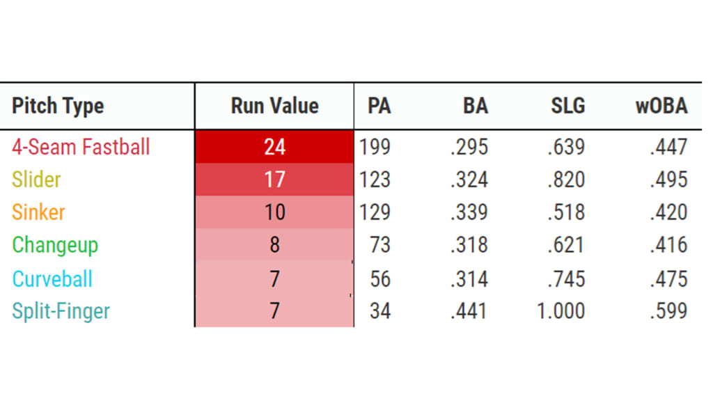 That’s a 7+ run value against six different pitches -- the most in the Majors. No other NL hitter has a 7+ run value against more than three pitch types. Only a trio of elite AL hitters have a 7+ run value against five separate pitches: Judge, Bobby Witt Jr. and Juan Soto.