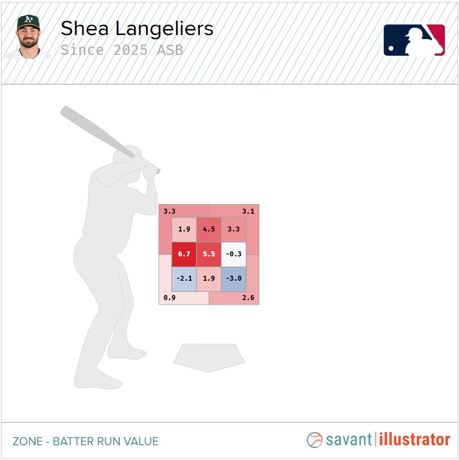 What's particularly interesting about Langeliers is that this surge hasn't come about due to an improvement in plate discipline. His 34.7% chase rate since the 2025 All-Star break is actually higher than it was before.