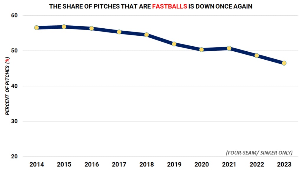 But only 46% of pitches are four-seamers or two seamers in the first place, a huge drop from the usual 55-60% it had been for years.