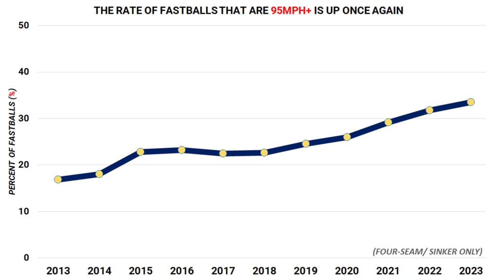 Approximately a third of fastballs (four-seamers and sinkers) are thrown 95 mph or harder, which is more than two-and-a-half times what it was in 2008.