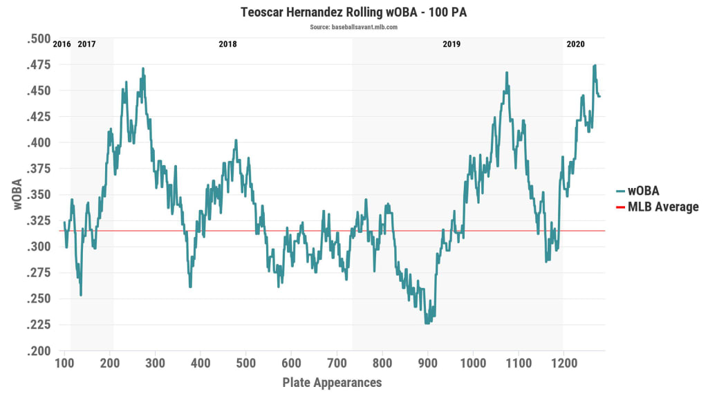 That’s half a season’s worth of games in which Hernández has been a top-25 hitter in baseball, marking his longest run of consistency so far. But can he really keep up this kind of production? It hasn’t been conventional, but Hernández is making adjustments that are working for him so far.