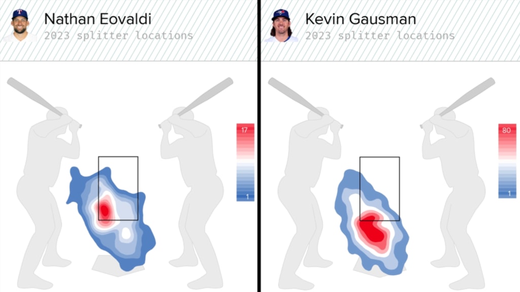 \n\n","providerName":"Twitter","providerUrl":"https://twitter.com","thumbnail_url":null,"type":"oembed","width":550,"contentType":"rich"},{"__typename":"Markdown","content":"A lot of pitchers who feature a fastball/splitter combo work vertically, like Ohtani and Kevin Gausman, whose splitters are almost always a chase pitch below the zone. Eovaldi works horizontally; his splitter is an attack pitch on the outside part of the plate, in the zone at one of the highest rates among splitter users.","type":"text"},{"__typename":"Image","caption":null,"contextualCaption":null,"contextualAspectRatio":null,"credit":null,"contentType":null,"format":"png","templateUrl":"https://img.mlbstatic.com/mlb-images/image/upload/{formatInstructions}/mlb/lirvtzuttmeloncffovw","type":"image"},{"__typename":"Markdown","content":"Eovaldi's fastball/splitter/cutter trio gives him a balanced attack to get hitters out -- each of those pitch types have accounted for a meaningful share of his runs prevented this season.\n\nIt all depends how he wants to attack a hitter in tandem with his heater. If he wants to go away, Eovaldi can throw the cutter off the outside edge to a righty, while his fastball will run back onto the corner, or hammer the low-outside corner with his splitter to a lefty after setting him up with a heater that has the same movement track but much different velocity. If he wants to go in, Eovaldi can run the splitter down-and-in under a righty's wrists, or bust a lefty with a cutter on the hands.\n\n\"He's just not afraid of anything,\" A's catcher Shea Langeliers said of Eovaldi after he shut down Oakland to reach a scoreless streak of 28 2/3 innings. \"He's going to come straight at you.\"","type":"text"},{"__typename":"OEmbed","html":"