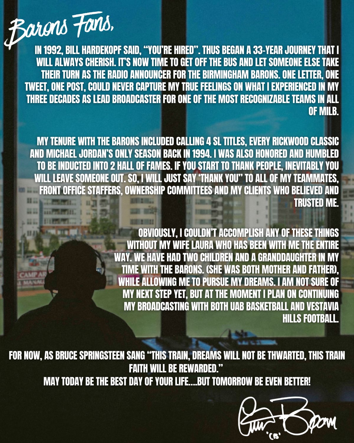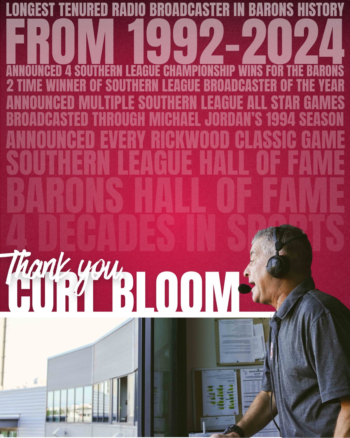 Birmingham is known as The Magic City, and for 32 years it was Curt Bloom’s job to cast a spell over the airwaves. Bloom, the longest-tenured broadcaster in Birmingham Barons history, announced at the end of last month that it “was time to get off the bus and let someone else take their turn” as the voice of one of Minor League Baseball’s most storied franchises. He's not retiring -- not by a long shot -- but his departure from the Barons marks the end of an era.