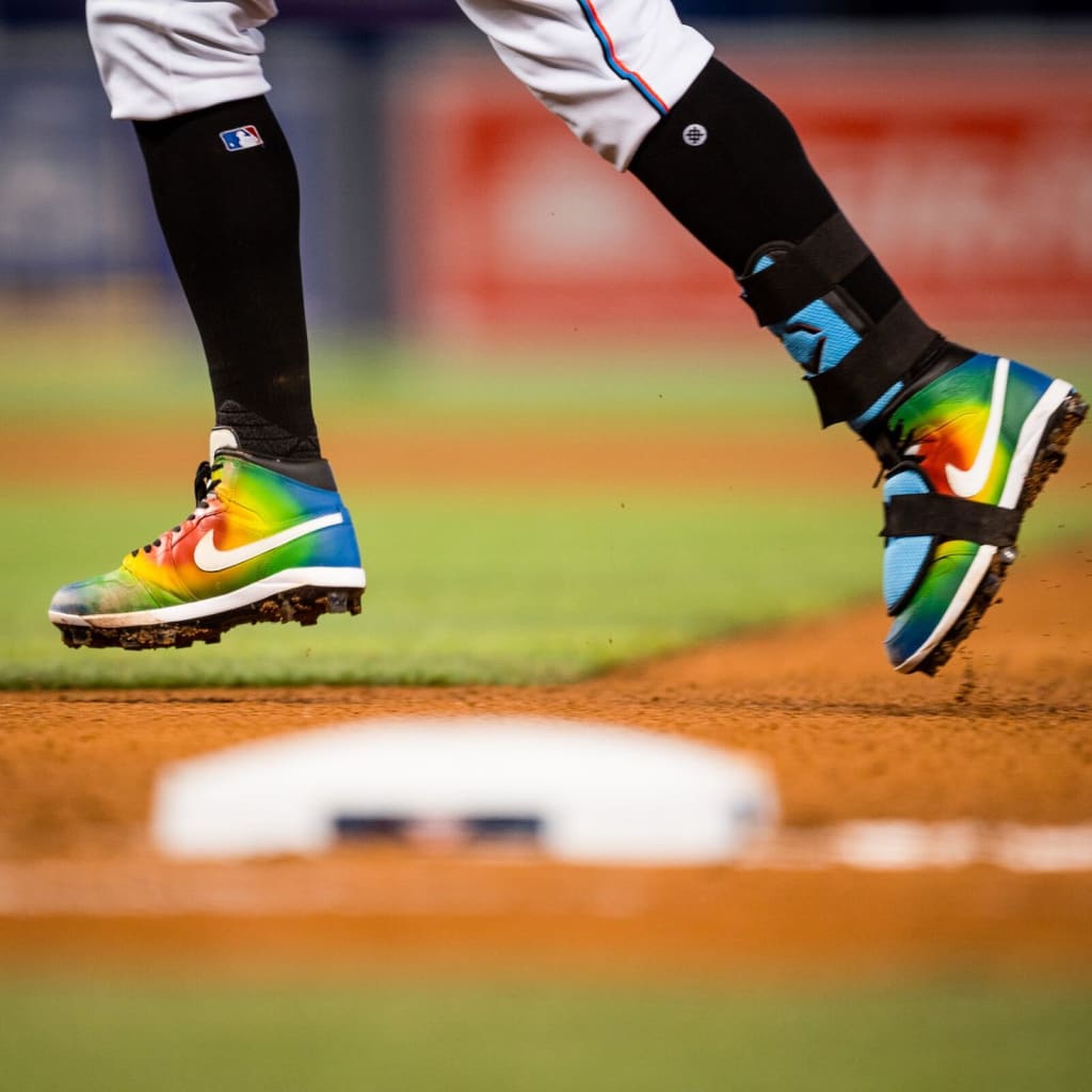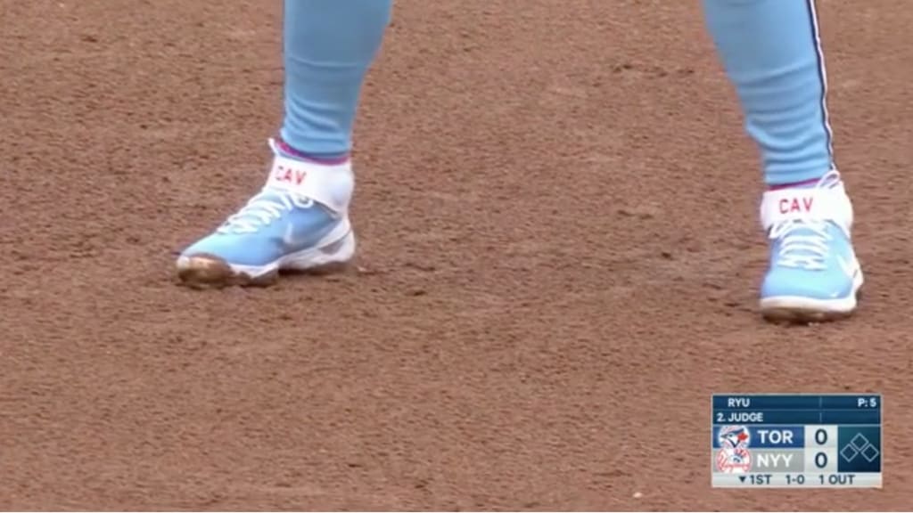 The Blue Jays looked great on the field without any cool cleats. Their fancy powder blue duds, harkening back to the unis that won back-to-back titles in 1992-93 (but this time with buttons!), just look fantastic. But third baseman Cavan Biggio wanted to complete the look, so he laced up a pair of powder blue cleats complete with “Cav” on them -- probably so no one took them by accident. Not only did they look phenomenal, but with plenty of cold weather games to come, we can’t wait until we see a player rock a full powder blue bodysuit.