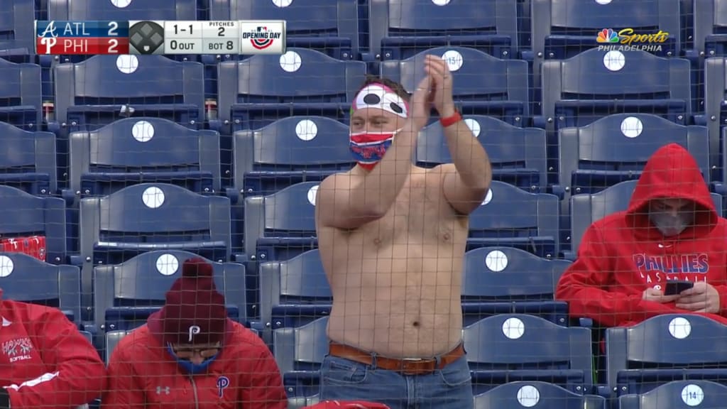 Maybe nobody was having a better time on Opening Day than this Phillies fan at Citizens Bank Park. No shirt, Phanatic headband, Phillies facemask (on upside-down) and clapping joyously for his beloved Phils while his friends pretended they didn't know who he was. Broadcaster John Kruk gave him one look and said he might be related to him. He said it might be his cousin Wayne.
