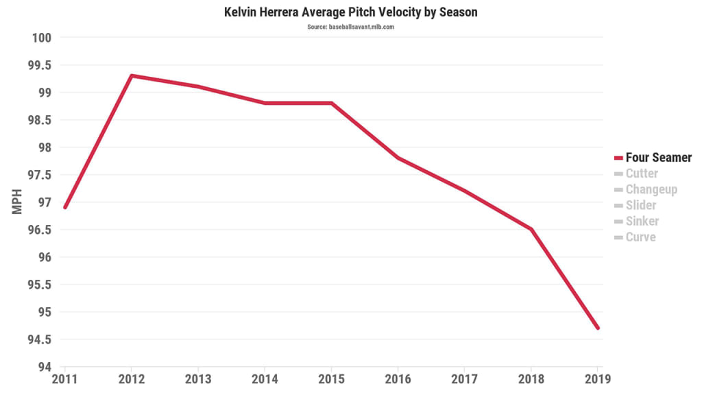 Herrera had fooled with the cutter off and on for a few years, but he's never thrown it anywhere near as regularly as he has so far in 2019. It's not hard to see why he's doing it, either; once one of the elite flamethrowers in the game, back when he was routinely at 98-99 mph with his fastball, Herrera has experienced velocity loss for a few years now, and he's currently operating at an average of 94.7 mph.