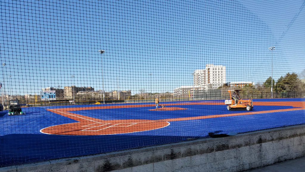 "We have a whole line of colors you can pick from," Aaron Klotz, who heads up the baseball and softball divisions of AstroTurf (he also coaches at Division III Adrian College). "It’s made down in our headquarters in Dalton, Ga., and it's manufactured with the colors in the quantities that are needed to do a baseball field. There’s no painting whatsoever: Batter's boxes, foul lines, there’s a logo in center field -- all that is synthetic turf and it’s cut and glued into the turf. It’s permanent. There’s no painting needed."