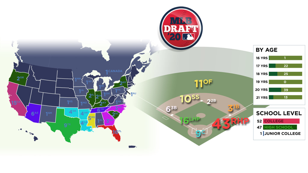 Field: 60 -- Ed Howard, SS, Mount Carmel HS (Ill.); Pete Crow-Armstrong, OF, Harvard-Westlake HS (Calif.); Drew Romo, C, The Woodlands HS (Tex.); Kyle Teel, C, Mahwah HS (N.J.); Milan Tolentino, SS, Santa Margarita Catholic HS (Calif.)
