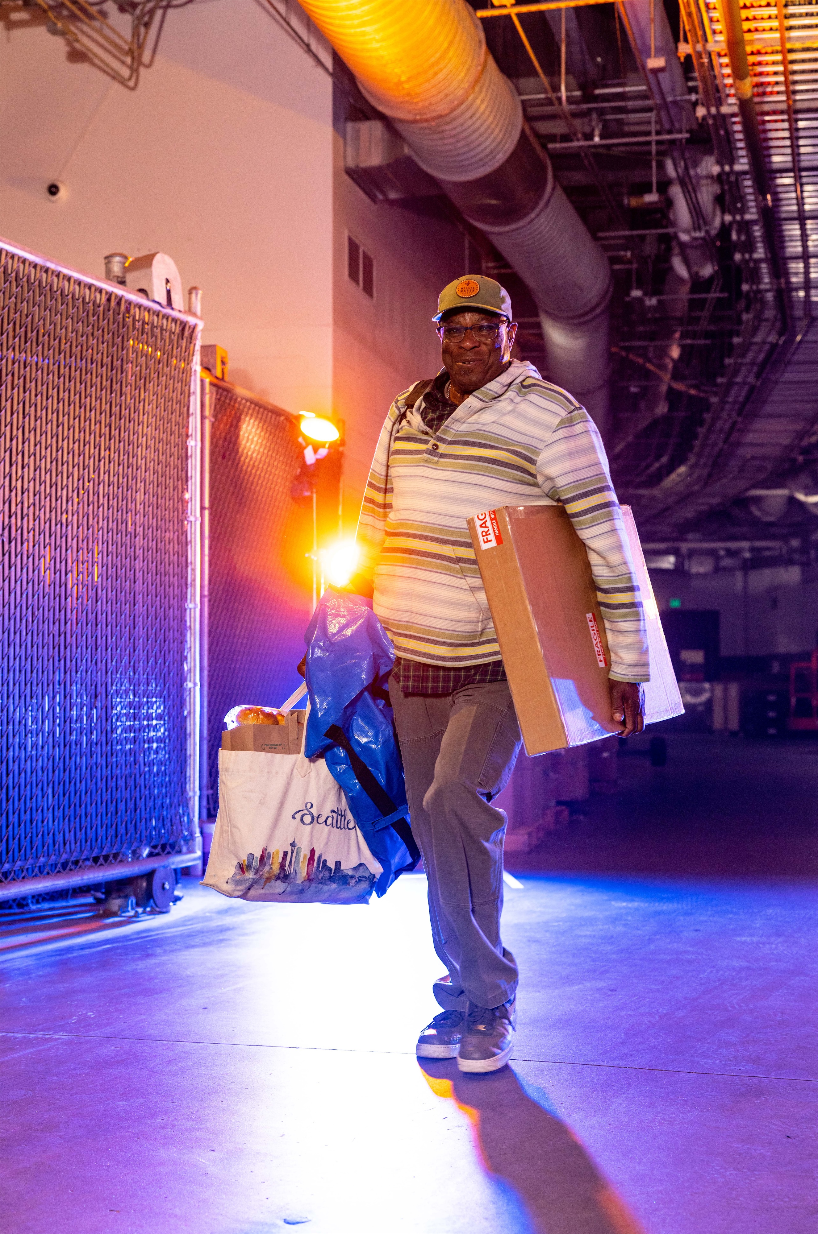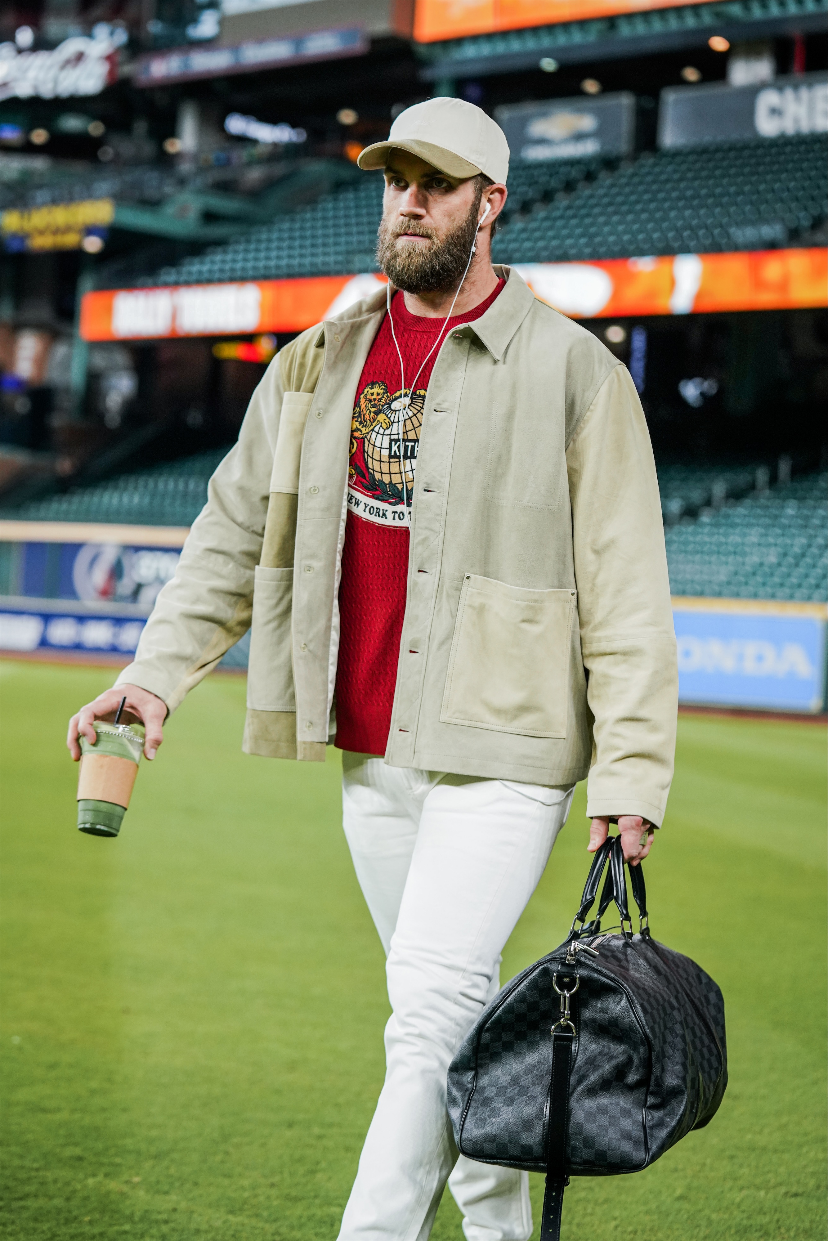 McKenzie’s take: Bryce, what do we got here? He walked in with a duffel, and he kept the earphones, so he kept the same energy from [Game 1], which I like. I like the consistency. And he’s got some Kith underneath. He’s got the Kith sweater underneath a jacket, with a hat to match. So I’m rating this a 10 out of 10.