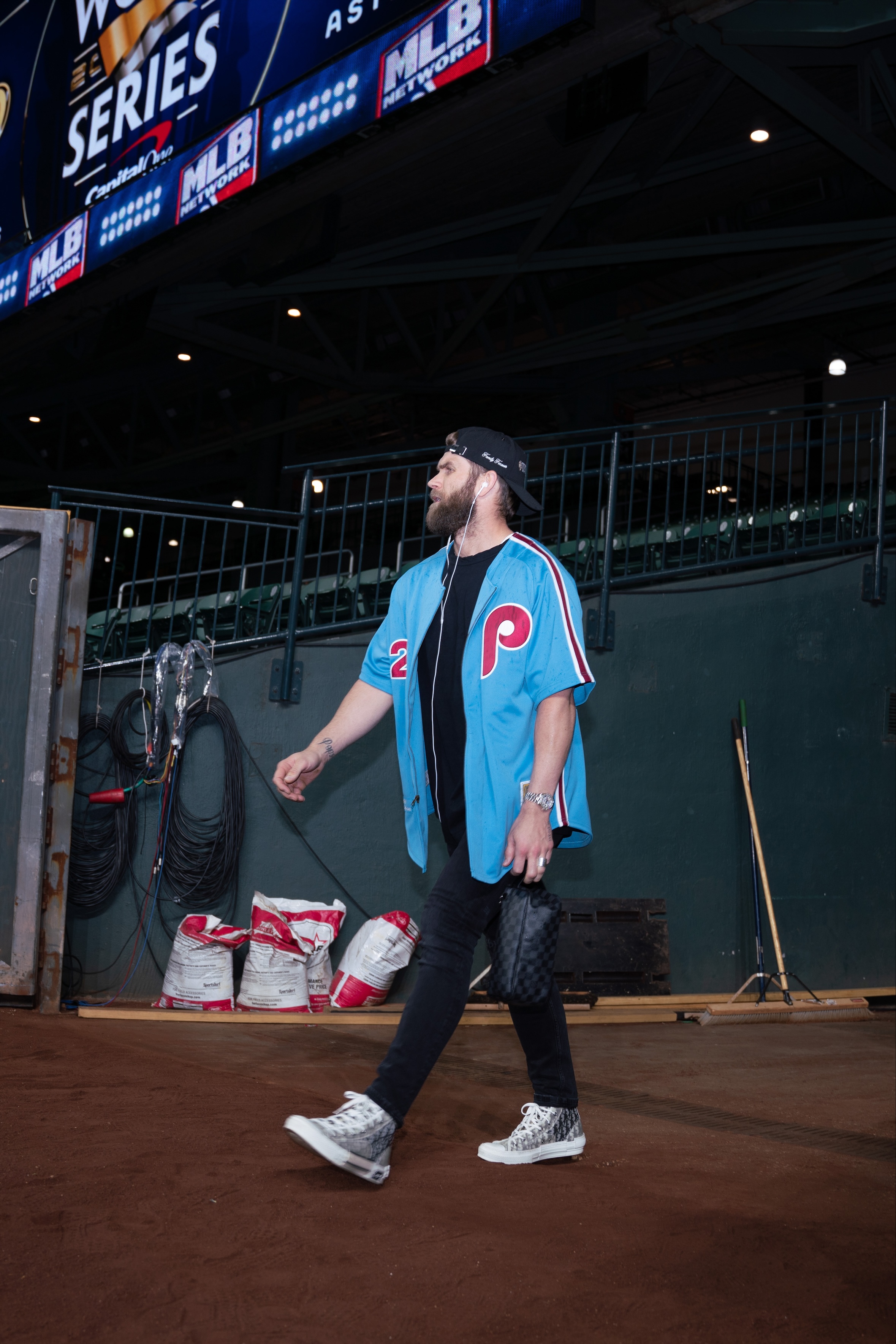 McKenzie’s take: I love, love, love the [Mike] Schmidt jersey out of him. I think he's channeling some Philly energy right there. And I love that out of him. And he's got the little style to go with it. He's got the Dior shoes on with the Louis Vuitton bag. He's got the watch. I mean, I think he came ready. And I think the wired headphones are a big, big flex. Everybody's got AirPods or Beats, but he went classic there from top to bottom, and I love it.