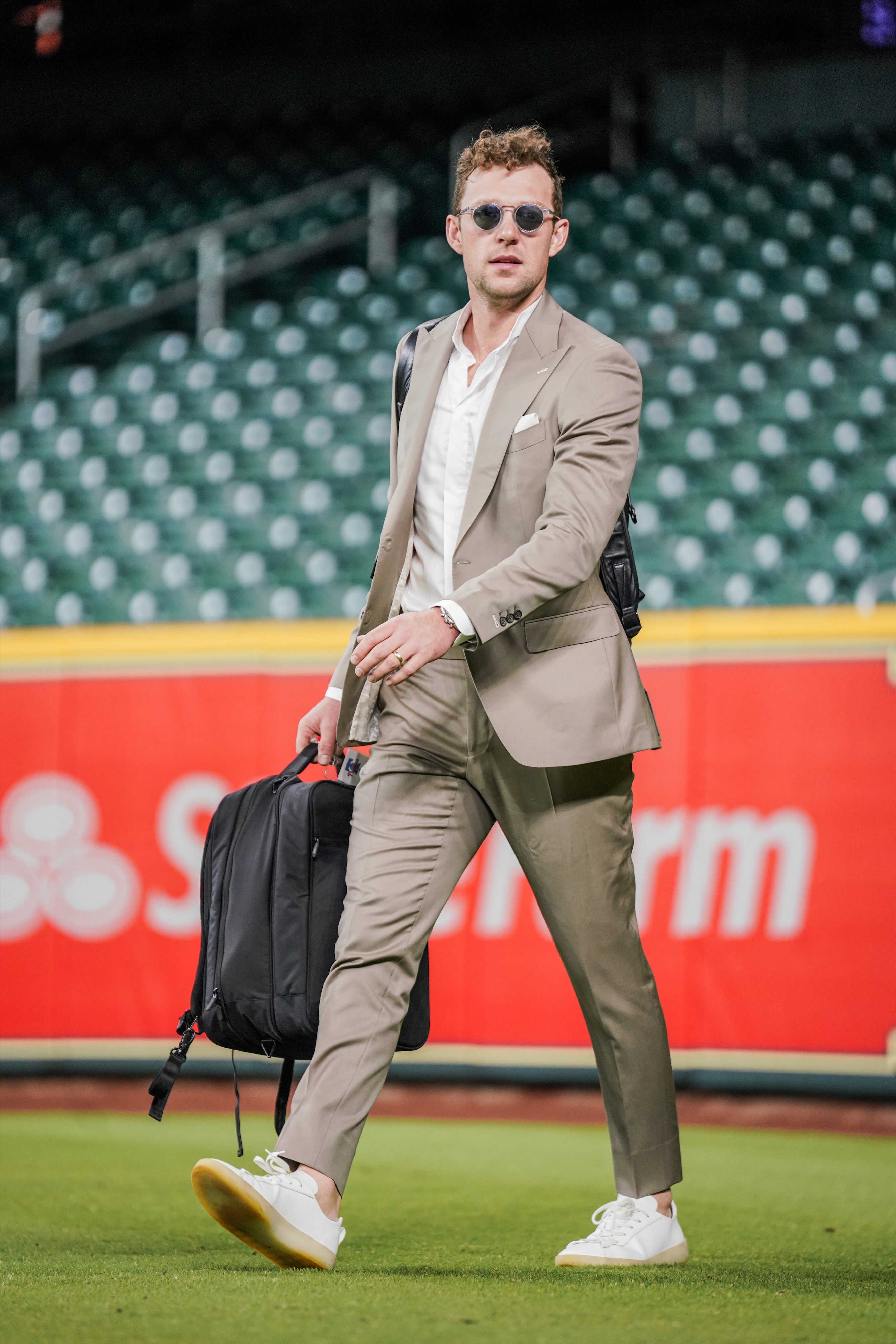 McKenzie’s take: I don't know what he’s got in his hands there. But he's got the Air Forces on, he's got some clean gray jeans. I don't know if he put a ton of thought into it. But the hat definitely matches the jacket. I mean, if I had to grade it out of 10, I’m giving Dusty maybe a seven there, maybe 7 1/2. But see, he looks mentally ready there. If Dusty looks happy, that’s all that matters.