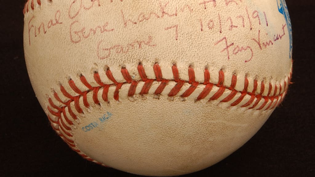 Fun facts: This ball is the World Series winner for the 1991 Twins. With the bases loaded in Game 7 of the ’91 Series, Minnesota pinch-hitter Gene Larkin drove this ball to left-center field for a walk-off hit, scoring Dan Gladden and returning the Commissioner's Trophy to the Twin Cities for the second time in five years.