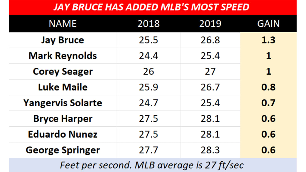 The point here isn't really about speed, because that's not Bruce's game. The point is about health, because a hobbled Bruce hit only .223/.310/.370 with nine homers last year. Compare that to 2016-17, when he hit a combined 69 homers with a .507 slugging percentage. It doesn't matter so much if he can run, but if these numbers can tell us that he's healthy enough to mash, it's a big deal.