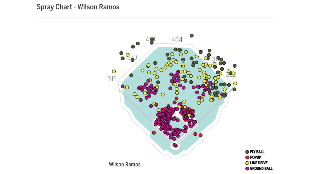 Wilson Ramos is Exhibit A. The Buffalo had the second-highest ground-ball rate in baseball last year, 63.4%. And when he hit the ball in the air, he only pulled it 18.2% of the time, one of the league's lowest rates of pulled air contact. Put Margot in right field and Kiermaier in center, and Ramos is hitting more than four of five balls to them. Plus, he's one of MLB's very slowest runners. Ramos' sprint speed last season was 22.9 feet per second -- fourth-slowest of 568 qualifiers.