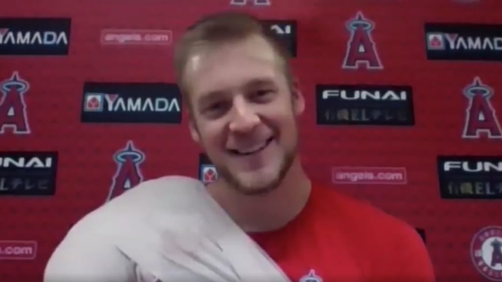 After recording a six-out save in the Angels’ 4-3 win over the A’s on Saturday, reliever Ty Buttrey was greeted with a special guest during his postgame Zoom interview with the media.