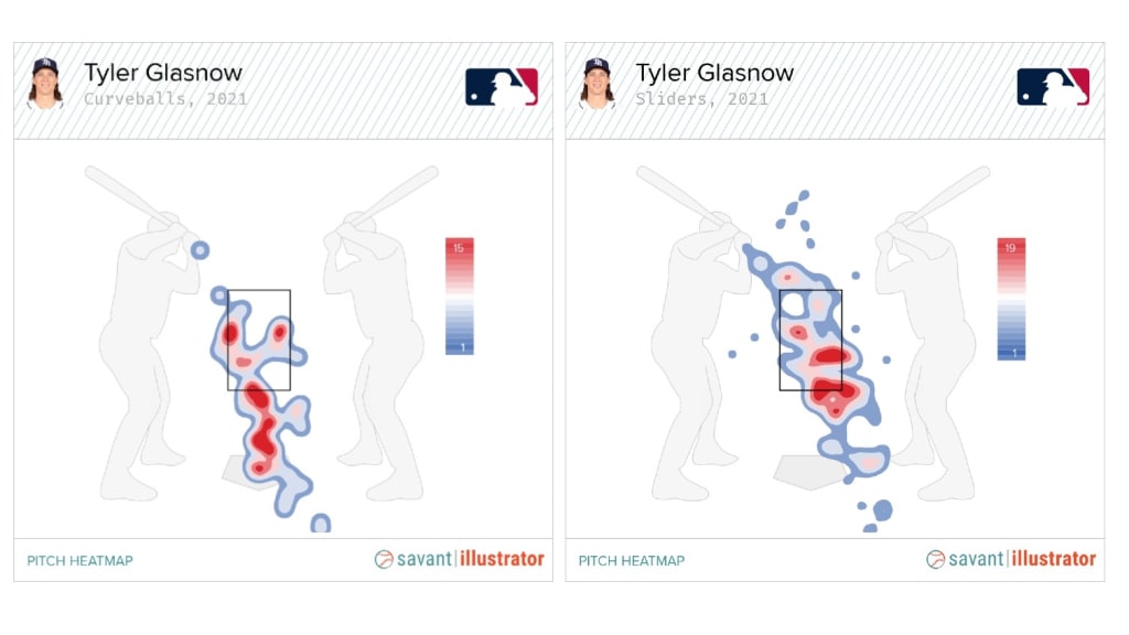 \n","providerName":"Twitter","providerUrl":"https://twitter.com","thumbnail_url":null,"type":"oembed","width":550,"contentType":"rich"},{"__typename":"Markdown","content":"In the past, Glasnow didn't hesitate to go to his curveball early in counts, but he has limited its exposure this season. Of the 47 curves he’s thrown this year, 41 have come with two strikes (87.2%).\n\nWhile it's uncertain if this new usage pattern is the cause, his curveball has been tougher to lay off with two strikes, as evidenced by his 61.0% swing rate on two-strike curves in 2021 (53.9% swing rate on two-strike curves in ’19-20). His putaway rate -- strikeouts per two-strike pitches thrown -- on curveballs is also up, from 34.9% in 2019-20 to 39.0%, one of the highest marks for any specific pitch in the game this year.\n\nEven this early in the season, it’s clear this is a different version of Glasnow than we’ve seen in the past. And that’s bad news for hitters who have to step into the box against him.","type":"text"}],"relativeSiteUrl":"/news/tyler-glasnow-better-than-ever-in-2021","contentType":"news","subHeadline":null,"summary":"Facing Tyler Glasnow was tough enough when he was only throwing fastballs and curveballs. Now that he’s added a new weapon to his arsenal, the Rays right-hander is just unfair.\nHeading into his fifth start of the season Friday night against the Blue Jays, Glasnow owns a 0.73 ERA with","tagline({\"formatString\":\"none\"})":null,"tags":[{"__typename":"InternalTag","slug":"storytype-article","title":"Article","type":"article"},{"__typename":"ContributorTag","slug":"thomas-harrigan","title":"Thomas Harrigan","type":"contributor"},{"__typename":"PersonTag","slug":"playerid-607192","title":"Tyler Glasnow","person":{"__ref":"Person:607192"},"type":"player"},{"__typename":"TaxonomyTag","slug":"player-tracking","title":"Statcast","type":"taxonomy"},{"__typename":"TeamTag","slug":"teamid-139","type":"team","title":"Tampa Bay Rays","team":{"__ref":"Team:139"}}],"type":"story","thumbnail":"https://img.mlbstatic.com/mlb-images/image/private/{formatInstructions}/mlb/aac4zmlzmche66ajfexy","title":"Tyler Glasnow is better than ever in 2021"},"getTeamsBySportId({\"ids\":[1]})":[{"__ref":"Team:133"},{"__ref":"Team:134"},{"__ref":"Team:135"},{"__ref":"Team:136"},{"__ref":"Team:137"},{"__ref":"Team:138"},{"__ref":"Team:139"},{"__ref":"Team:140"},{"__ref":"Team:141"},{"__ref":"Team:142"},{"__ref":"Team:143"},{"__ref":"Team:144"},{"__ref":"Team:145"},{"__ref":"Team:146"},{"__ref":"Team:147"},{"__ref":"Team:158"},{"__ref":"Team:108"},{"__ref":"Team:109"},{"__ref":"Team:110"},{"__ref":"Team:111"},{"__ref":"Team:112"},{"__ref":"Team:113"},{"__ref":"Team:114"},{"__ref":"Team:115"},{"__ref":"Team:116"},{"__ref":"Team:117"},{"__ref":"Team:118"},{"__ref":"Team:119"},{"__ref":"Team:120"},{"__ref":"Team:121"}],"getHeaderFromForgePath({\"contentSource\":\"MLB\",\"headerPath\":\"/_navs/header/mlb/global-nav\",\"locale\":\"en-US\",\"paletteKey\":\"mlb-base-palette\",\"propertiesKey\":\"mlb-global-properties\"})":{"__typename":"Header","navigation":[{"__typename":"NavItem","customPropertiesString":"align:right;","icon":null,"linkTarget":null,"linkText":"MLB.TV","linkUrl":"https://www.mlb.com/tv?&affiliateId=mlbMENUtv","placement":"right","visible":"true","subNav":[{"__typename":"SubnavColumn","title":null,"navigation":[{"__typename":"NavItem","placement":null,"linkText":"Buy MLB.TV","linkUrl":"/live-stream-games/subscribe?&affiliateId=mlbMENUtv","linkTarget":null,"visible":"true","icon":null,"tooltip":null,"customPropertiesString":null},{"__typename":"NavItem","placement":null,"linkText":"Buy At Bat","linkUrl":"/live-stream-games/subscribe/at-bat?&affiliateId=mlbMENUtv","linkTarget":null,"visible":null,"icon":null,"tooltip":null,"customPropertiesString":null},{"__typename":"NavItem","placement":null,"linkText":"Buy MLB Network","linkUrl":"/live-stream-games/subscribe/mlbnetwork?&affiliateId=mlbMENUtv","linkTarget":null,"visible":null,"icon":null,"tooltip":null,"customPropertiesString":null},{"__typename":"NavItem","placement":null,"linkText":"All Packages","linkUrl":"/live-stream-games/products?&affiliateId=mlbMENUtv","linkTarget":null,"visible":"false","icon":null,"tooltip":null,"customPropertiesString":null},{"__typename":"NavItem","placement":null,"linkText":"Watch & Listen","linkUrl":"/live-stream-games?&affiliateID=mlbMENUtv","linkTarget":null,"visible":"true","icon":null,"tooltip":null,"customPropertiesString":null},{"__typename":"NavItem","placement":null,"linkText":"Help Center","linkUrl":"https://support.mlb.com/s/?&affiliateID=mlbMENUtv","linkTarget":null,"visible":"true","icon":null,"tooltip":null,"customPropertiesString":null}]}]},{"__typename":"NavItem","customPropertiesString":"align:right;","icon":null,"linkTarget":null,"linkText":"Tickets","linkUrl":"/tickets","placement":"right","visible":null,"subNav":[{"__typename":"SubnavColumn","title":null,"navigation":[{"__typename":"NavItem","placement":null,"linkText":"All-Star Tickets","linkUrl":"/all-star/tickets","linkTarget":null,"visible":"true","icon":null,"tooltip":null,"customPropertiesString":"expires:1752631200;"},{"__typename":"NavItem","placement":null,"linkText":"Home Run Derby Ticket Offers","linkUrl":"/tickets/fan-value/home-run-derby-offers","linkTarget":null,"visible":null,"icon":null,"tooltip":null,"customPropertiesString":"expires:1753210800;"},{"__typename":"NavItem","placement":null,"linkText":"East-West Classic","linkUrl":"/events/rickwood/tickets","linkTarget":null,"visible":null,"icon":null,"tooltip":null,"customPropertiesString":"expires:1750359600;"},{"__typename":"NavItem","placement":null,"linkText":"Spring Training","linkUrl":"/tickets/spring-training","linkTarget":null,"visible":"true","icon":null,"tooltip":null,"customPropertiesString":"expires:1742958000;"},{"__typename":"NavItem","placement":null,"linkText":"Postseason Tickets","linkUrl":"/postseason/tickets","linkTarget":null,"visible":"false","icon":null,"tool