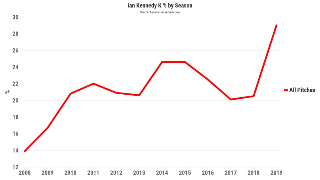 Working as a full-time reliever for the first time in his 13-year career, Kennedy has been... fantastic, actually, with a 3.18 ERA, posting a 41/7 K/BB ratio in 34 innings. In his first three years with the Royals, he'd struck out between 20 and 22% of hitters; this year, that's nearly 29%. When Wade Davis was helping to finish off that World Series in 2015, his strikeout rate was 31%.