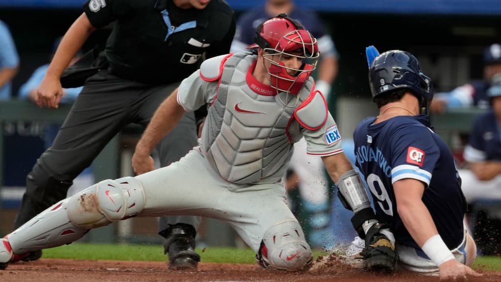 Pasquantino’s foot touched the plate just before Realmuto’s glove tagged him.