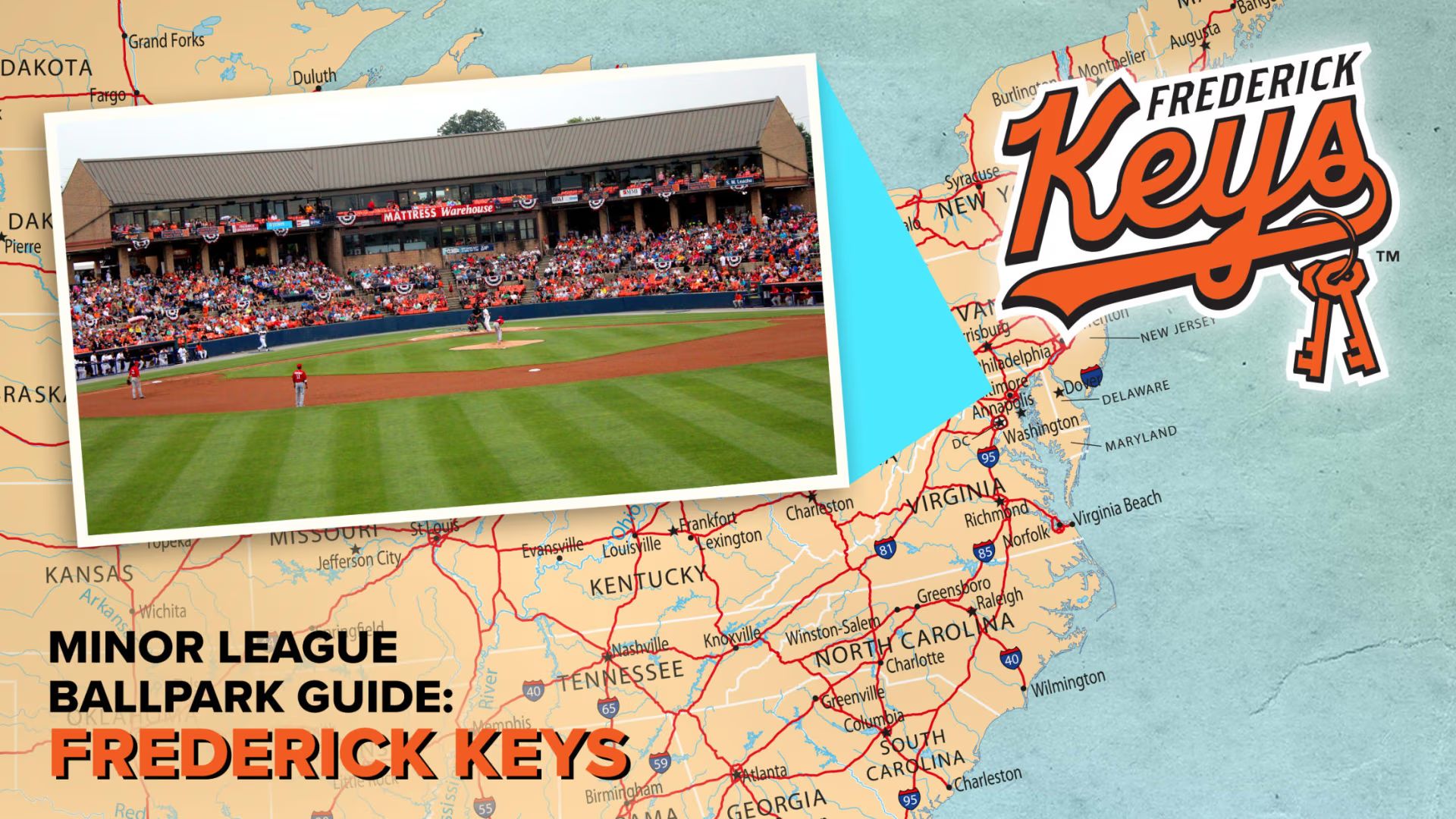 After five years in the MLB Draft League, the Keys are back in the Orioles' system, having swapped places with the organization's former High-A affiliate, the Aberdeen IronBirds. Frederick is located approximately three hours northwest of Delmarva, with the Chesapeake Bay Bridge (not to be confused with the aforementioned Chesapeake Bay Bridge-Tunnel) serving as the pathway between Maryland's Eastern and Western Shores. Harry Grove Stadium is a charming, intimate facility, offering close-up views of the action. The Keys' name is a tribute to "Star Spangled Banner" author Francis Scott Key, who is buried in a cemetery across the street from the ballpark. Actual keys factor into the ballpark experience as well, via the "Shake Your Keys" team theme song that plays during the seventh-inning stretch.