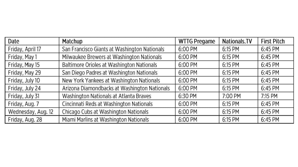 The Nationals’ exclusive local over-the-air partner, WTTG FOX 5 will produce expanded local pregame shows with host Chad Ricardo for each simulcast leading in to Nationals.TV game broadcasts called by play-by-play announcer Dan Kolko, analyst Kevin Frandsen and host and reporter Alexa Datt. The schedule of over-the-air simulcasts is below.