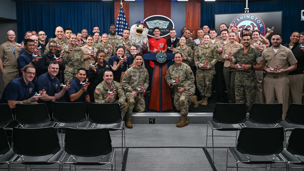 Just less than five miles from Nationals Park, current and former players often pay visits to the Pentagon to meet and interact with service members and Department of Defense employees. In August, Nationals outfielder Jacob Young and his wife, Caroline, visited the Pentagon and gifted DoD officials signed hats and 60 Jacob Young bobbleheads. Outfielder James Wood gifted 60 of his oversized bobbleheads to the sergeant major of the Army, Sgt. Maj. Michael R Weimer, as well as soldiers from across the National Capital Region. Former infielder Ryan Zimmerman met with the then-chief of staff of the Air Force, Gen. David W. Allvin, to deliver his NATS20 Mystery Moments bobblehead to Air and Space Force personnel stationed at the Pentagon.