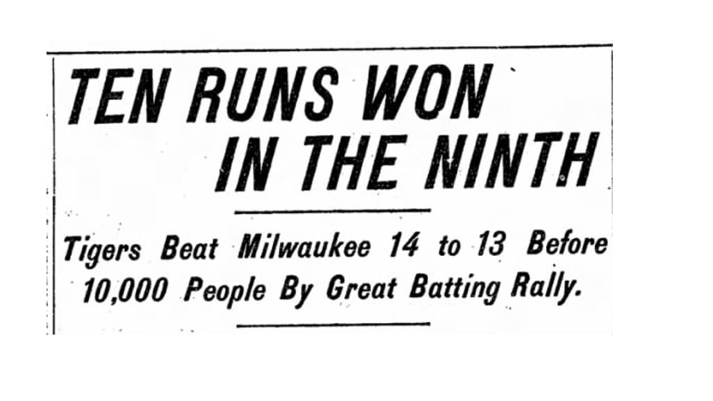 With the crowd going wild -- “Hats were being thrown in the air, coats were flying and everyone was yelling themselves hoarse” was how the Detroit Free Press described it -- the Tigers loaded the bases with two outs but were still down, 13-9. Kid Gleason then hit a grounder to Jimmy Burke that should have ended the game. Instead, Burke dropped the ball, allowing two runs to score and keeping the Tigers' hopes alive. Ducky Holmes then beat out a slow grounder to cut the lead to 13-12.