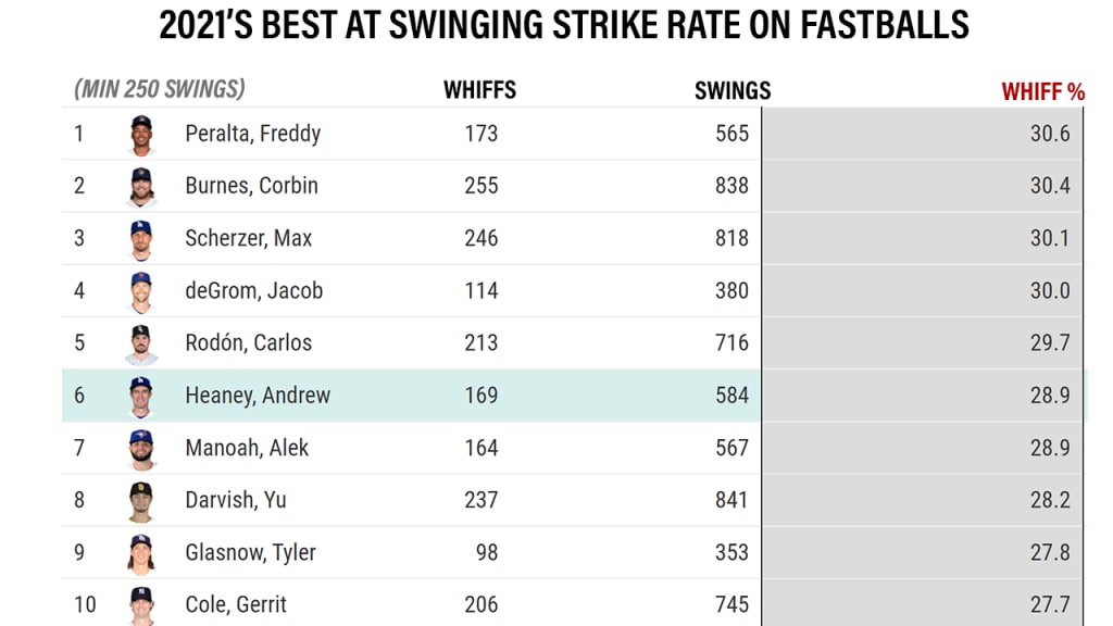 Heaney walks fewer than average as well, so if you were to sort those 129 pitchers by the largest differences between their strikeout rate and walk rate, Heaney would be 31st, just behind Buehler, on a list where the top 30 could credibly be a list of the 30 best starters in the game. On the four-seam fastball, nearly 29% of the time a batter offered a swing against Heaney, he missed, putting the lefty very high on an incredibly impressive list.
