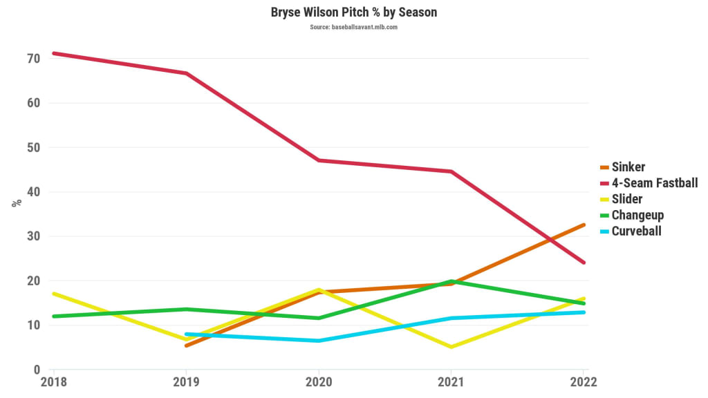 But the four-seamer has become less and less a part of Wilson's arsenal as the average velocity dropped from 94.9 mph when he made his MLB debut in 2018 to 94.7 mph in ‘19 to 94.1 mph in ‘20 to 93 mph in ‘21 and 92.7 in ‘22 -- when, for the first time, it wasn’t his primary pitch.