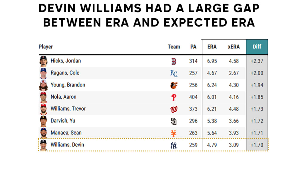 If that gap between the 4.79 ERA and his 3.09 expected ERA seems massive, it is. Setting aside those with an xERA north of 5 – which is to say, pitchers who threw poorly in the first place – and looking at a minimum of 250 batters faced, only a small handful had a larger gap than Williams and his 1.70.