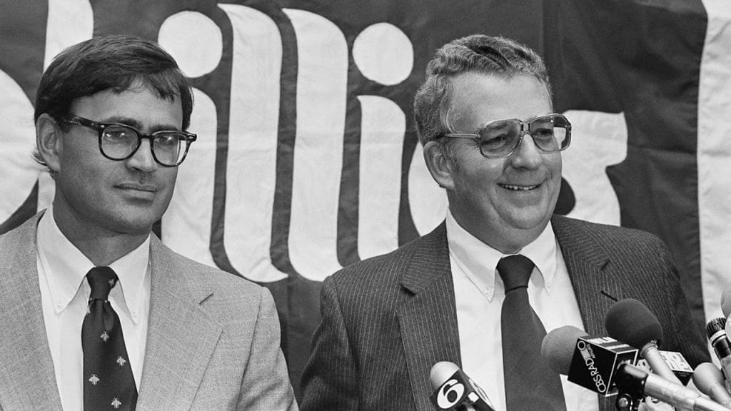 It was a yes/no vote, needing only a simple majority of the NL's 12 teams to approve. Pirates GM Harding Peterson entered the meeting with very straightforward instructions from owner John Galbreath: Vote as the Phillies voted. As for Philly, owner Ruly Carpenter -- on the left in the photo above -- told his vice president, Bill Giles, to vote for the DH. The reason for this was simple: Philly had Greg Luzinski in left field with young Keith Moreland searching for playing time, two strong bats who weren't particularly skilled in the outfield.