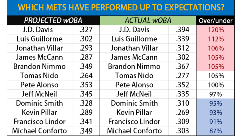 J.D. Davis (.304/.413/.500) has been very good, in obviously limited time. So has Brandon Nimmo, when he's been available. Backups Tomás Nido, Luis Guillorme, and Jonathan Villar have offered more than you’d expect. Alonso has given pretty much exactly what was expected. So has James McCann, because the projections correctly included a career of underwhelming performance, not just 111 very good plate appearances for the 2020 White Sox.