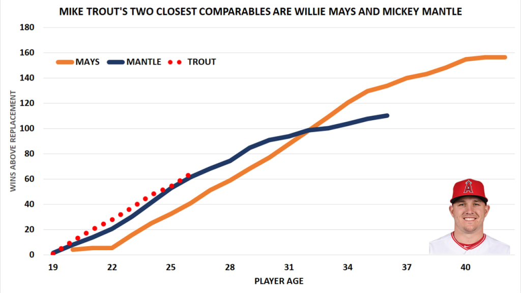 While it's difficult to find a large number of close comps, MLB.com senior data architect Tom Tango used Trout’s exact age (he turned 27 last Aug. 7), and WAR over the past four seasons (an MLB-high 36.6), to come up with a small group of 21. This group was split into two and served as a basis for projecting Trout over the duration of his new contract.